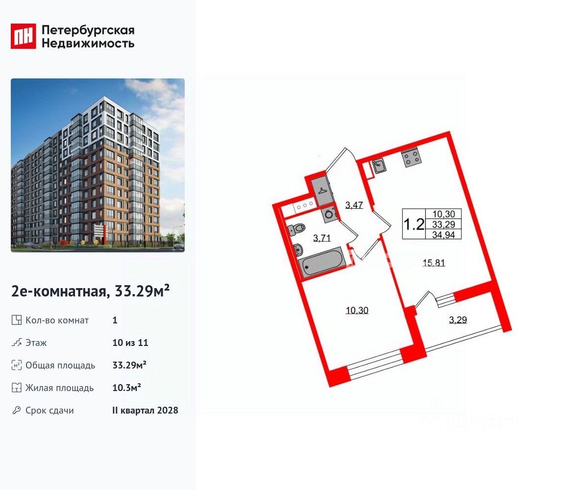 Удобная, классическая, функциональная европланировка, большая кухня-гостиная 15.81 м², вместительная прихожая 3.47 м². Общая площадь квартиры - 33.29 м², жилая 10.3 м², высота потолка 2.77 м.