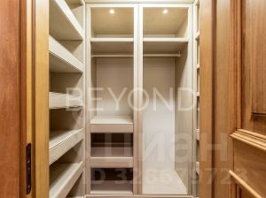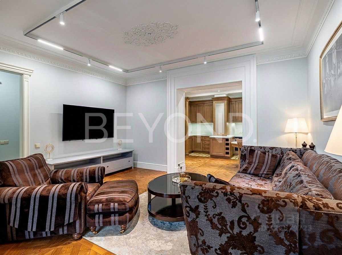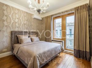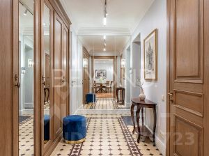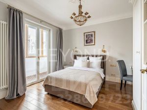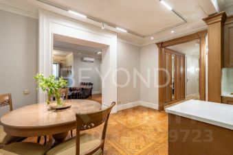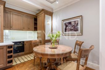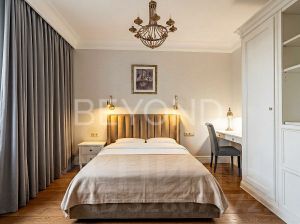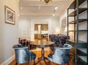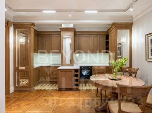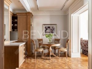 Интерьер реализован по индивидуальному проекту с использованием натуральных материалов и предметов европейского производства. Наборный паркет из массива дуба, мебель и встроенные решения, выполненные на заказ в Италии, формируют цельное и благородное пространство. Освещение представлено люстрами из муранского стекла Rosi — выразительным акцентом, подчеркивающим характер интерьера.