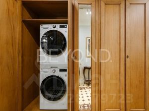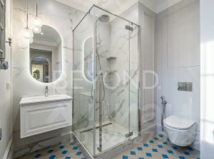 В отделке и оснащении использованы проверенные бренды: сантехника Villeroy Boch и Jacob Delafon, организована построчная с техникой LG. В квартире предусмотрены тёплые полы и система кондиционирования, обеспечивающие комфорт в любое время года.