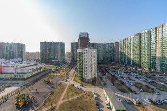 Двор - настоящая редкость для плотной застройки в Мурино: просторный и зеленый, недавно высадили деревья и кустарники, потому к лету двор станет еще более привлекательным