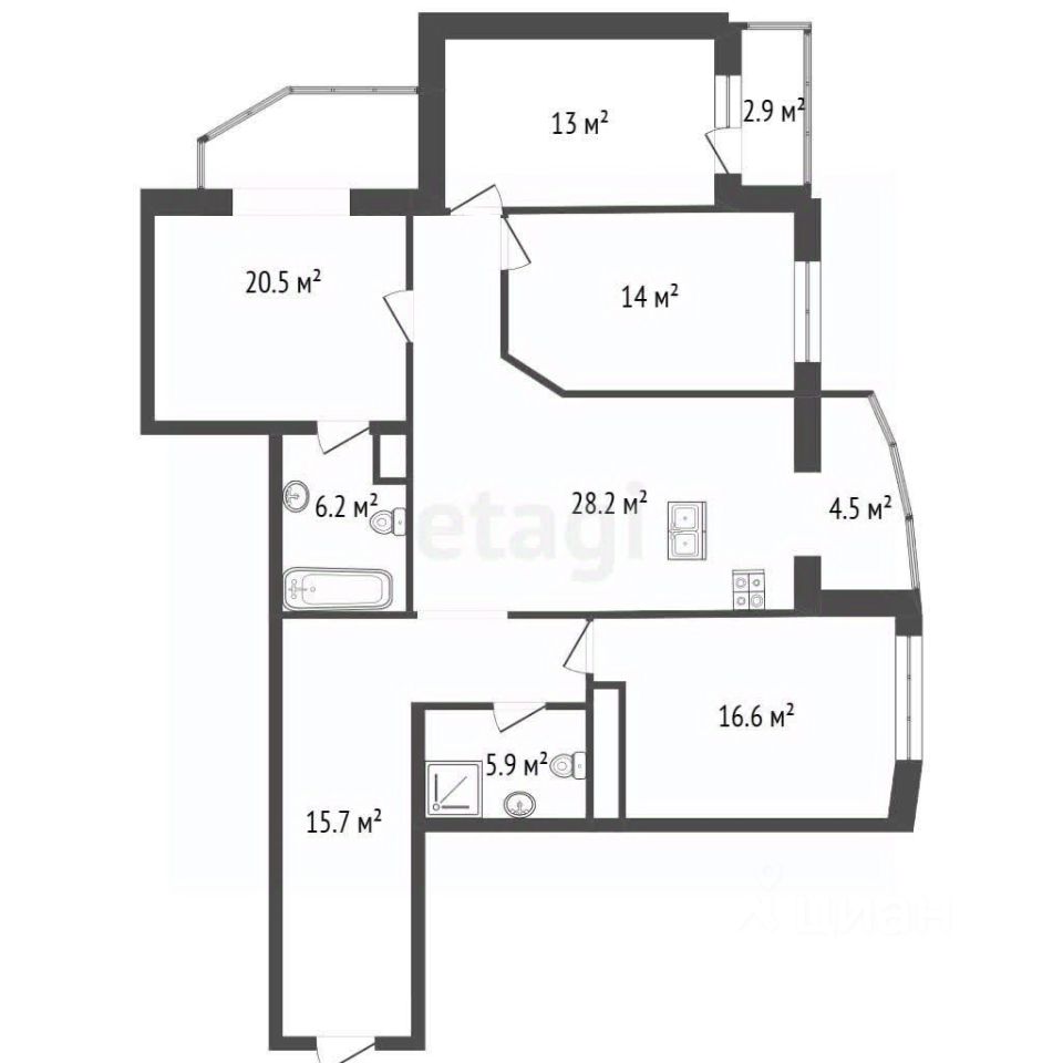 Функциональная планировка: кухня-гостиная объединяет пространство для жизни и отдыха, четыре отдельные комнаты обеспечивают комфорт каждому члену семьи.