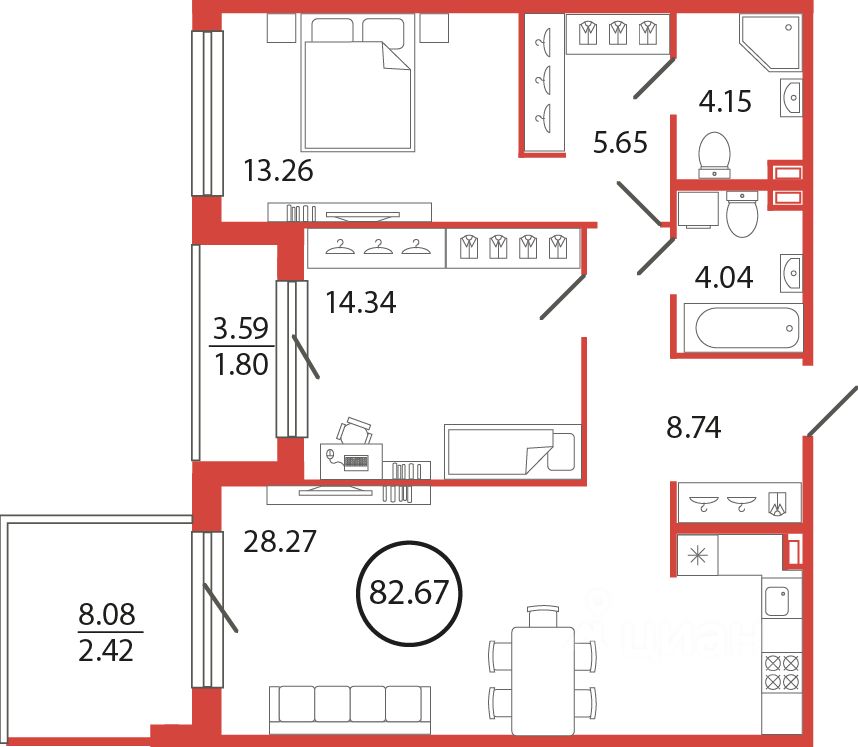 Продаётся e3 комнатная квартира (евро) в жилищном комплексе "Энфилд" (корпус Дом 21 Секция 2). Общая площадь 82,67 кв. м, площадь комнат 13,26 кв.м, 14,34 кв.м. 2 санузла. Квартира расположена на 2 этаже 12 этажного дома. Срок сдачи корпуса IV квартал 2027 года.