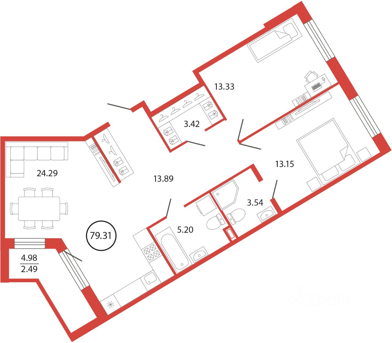 Продаётся e3 комнатная квартира (евро) в жилищном комплексе "Энфилд" (корпус Дом 18 секция 4). Общая площадь 75,08 кв. м, площадь комнат 13,33 кв.м, 13,33 кв.м. 2 санузла. Квартира расположена на 2 этаже 12 этажного дома. Срок сдачи корпуса IV квартал 2027 года.