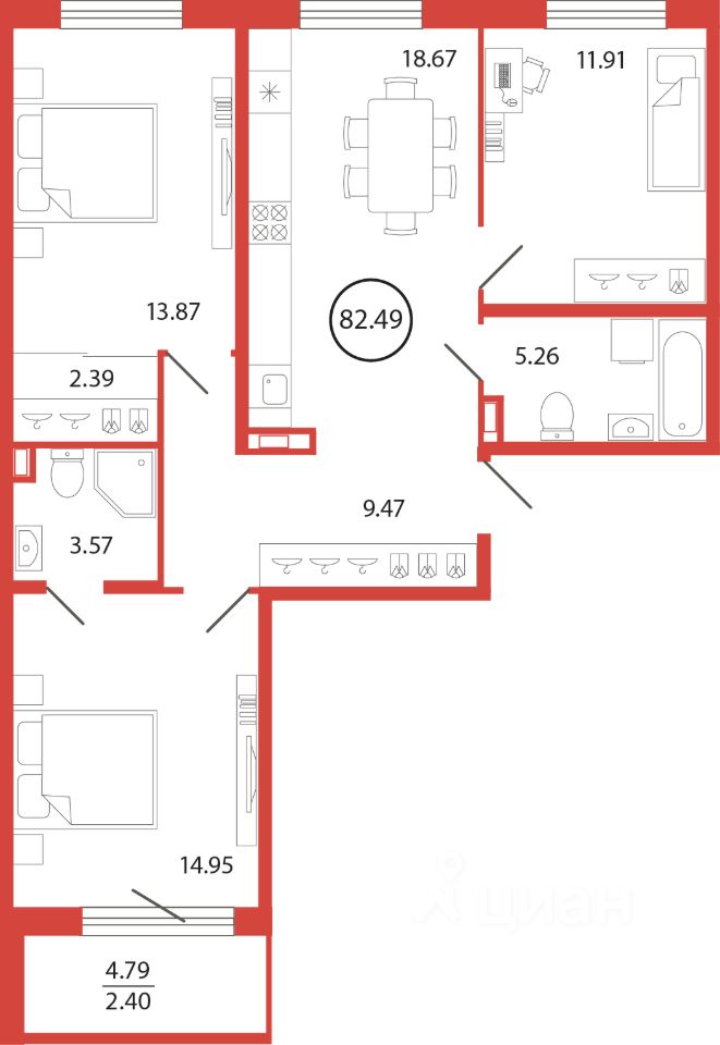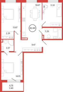 Продаётся e4 комнатная квартира (евро) в жилищном комплексе "Энфилд" (корпус Дом 18 секция 6). Общая площадь 82,49 кв. м, площадь комнат 14,95 кв.м, 13,87 кв.м, 11,91 кв.м. 2 санузла. Квартира расположена на 2 этаже 12 этажного дома. Срок сдачи корпуса IV квартал 2027 года.