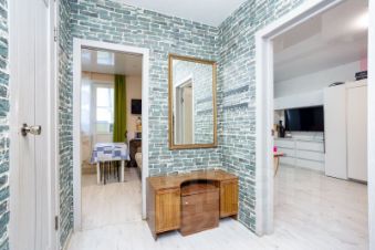 Планировка квартиры включает раздельный санузел и просторный коридор, что позволяет комфортно разместиться 2-3 членам семьи.