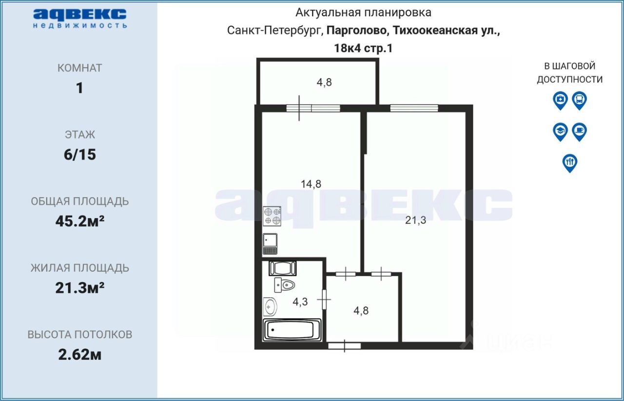 Кухня гостиная 14,8 кв.м. и комната 21,3 кв.м. зонирование, которой позволяет сделать гардеробную, при желании. В квартире произведен косметический ремонт. Просторная лоджия (4,8 кв.м.) с видом на лес — редкое преимущество для городской квартиры.