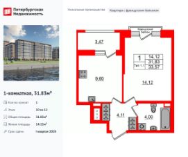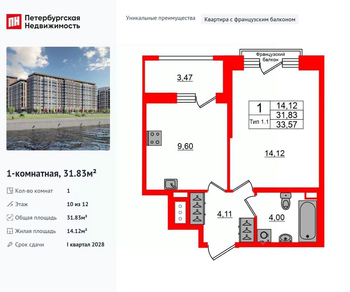 Уникальная планировка, кухня 9.6 м², вместительная прихожая 4.11 м². Общая площадь квартиры - 31.83 м², жилая 14.12 м², высота потолка 2.77 м.