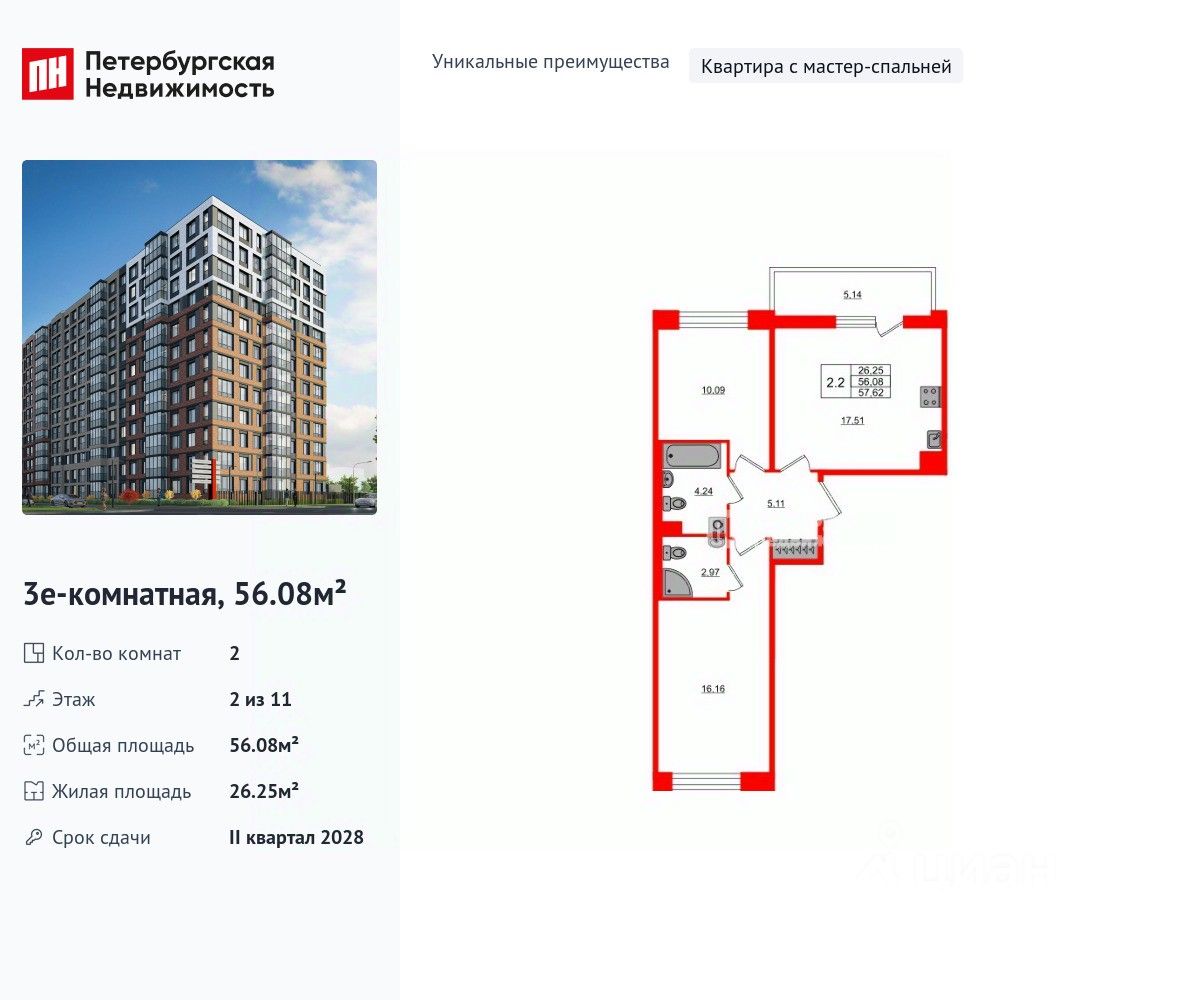 Уникальная, функциональная европланировка, большая кухня-гостиная 17.51 м², вместительная прихожая 5.11 м². Общая площадь квартиры - 56.08 м², жилая 26.25 м², высота потолка 2.77 м.