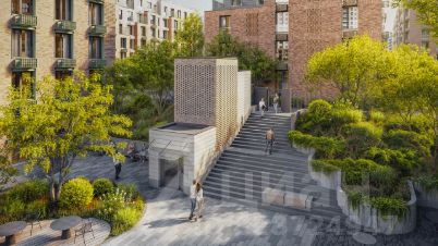 Дворы домов проектируются закрытыми и свободными от автомобилей. Проектом предусмотрен двухуровневый паркинг на 721 машиноместо с доступом на лифте, парадным входом и бесконтактной системой въезда с определением гос. номера автомобиля. Внутриквартальная территория приподнята над поверхностью земли на 3,5 м. Образующееся между домами "плато", куда ведут пологие лестницы и пандусы, предоставляет жителям благоустроенное пространство где предусмотрены безопасные игровые и спортивные площадки для детей разного возраста, амфитеатр, а также места для общего досуга и общения жителей. Проектом предусмотрены колясочные и велопарковки. Отсутствие ступенек и крылец обеспечит удобный доступ в парадные для всех категорий граждан.