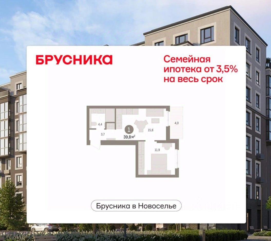 1-комн. квартира от застройщика с предчистовой отделкой в ЖК "Брусника в Новоселье" на 7 этаже. Общая площадь: 39.8 кв.м., жилая: 11.9 кв.м., площадь просторной кухни-столовой: 15.8 кв.м. Все окна выходят на одну сторону. В квартире одна лоджия, один совмещенный санузел. Высота потолков 2.7 м.