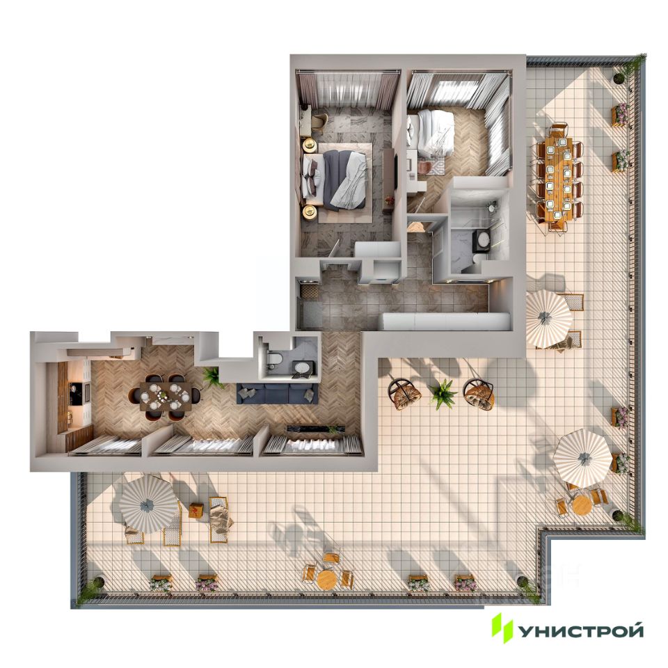 Проект предлагает разнообразие планировок: студии, 1-3-комнатные квартиры, евроформаты. Также есть коллекционные квартиры с мастер-спальнями с ванными и гардеробными, и форматы с саунами. Угловое витражное остекление наполняет квартиры светом. Квартиры с террасами — идеальный выбор для занятий спортом и встреч с друзьями. На последних этажах расположены пентхаусы.