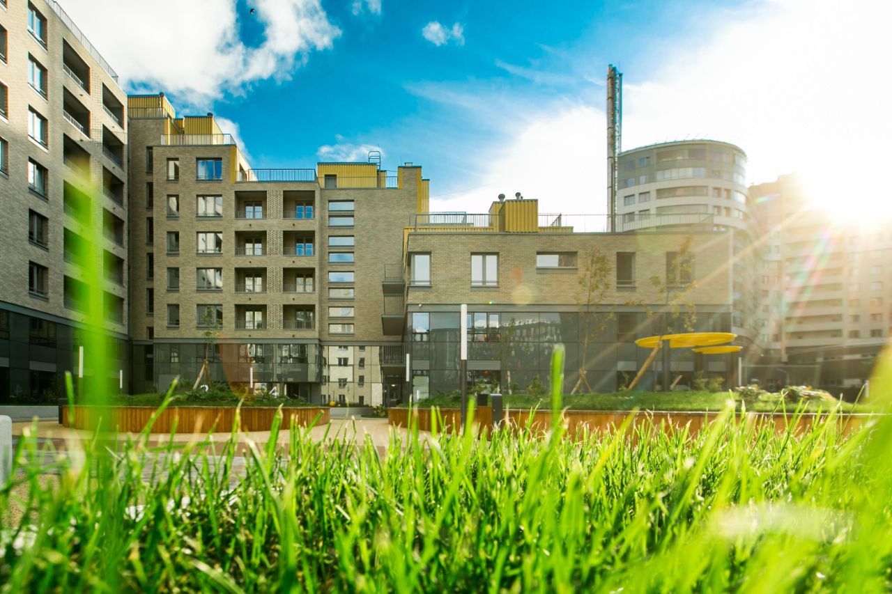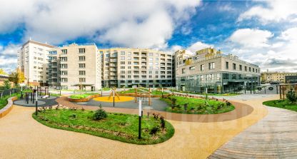 Проект воплощает гармонию между городской активностью и возможностью уделить время себе. Предусмотрено два уровня зонирования: первый — общедоступный с офисами и паркингом, второй — приватный двор без машин и доступа посторонних. На территории предусмотрены зоны отдыха и амфитеатр, игровые площадки, воркаут и спортивные зоны.