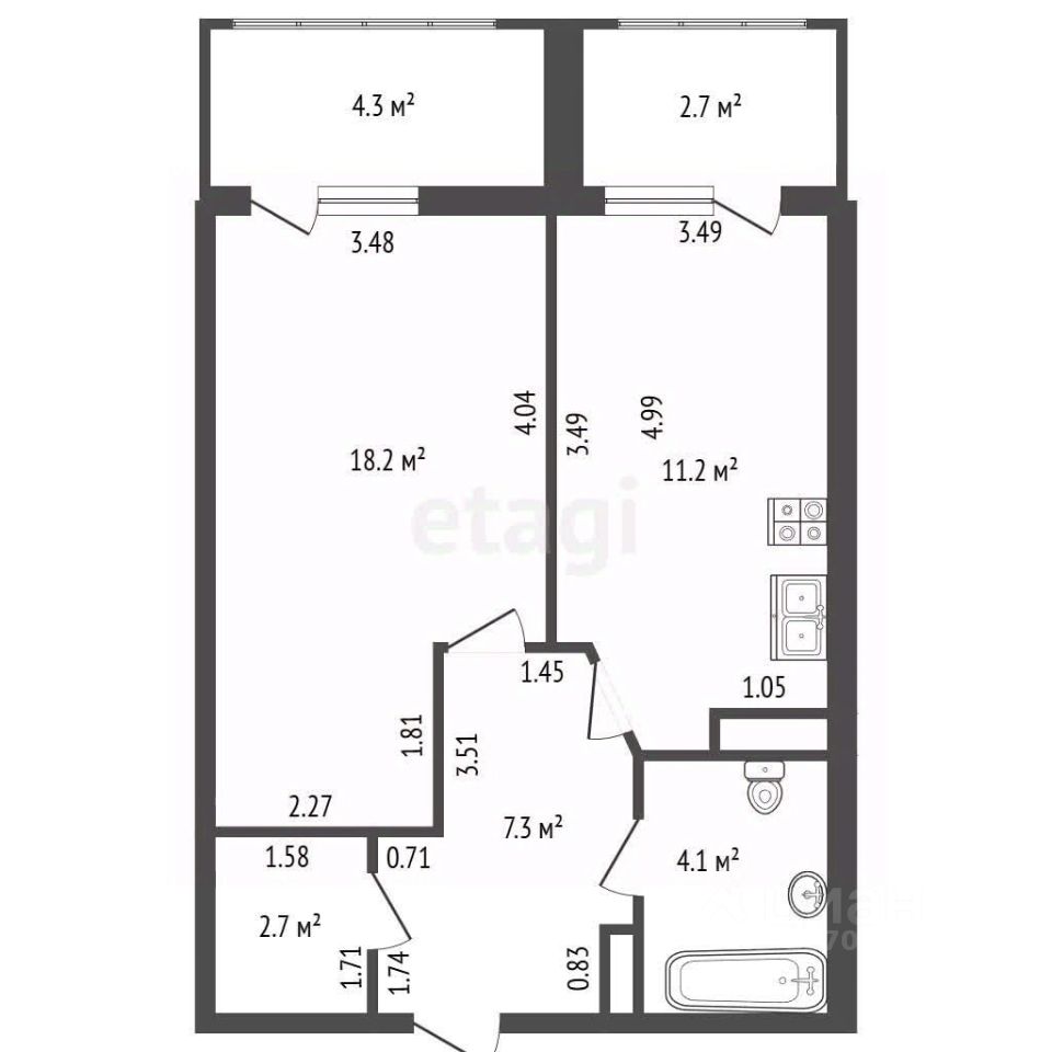- Санузел: Совмещенный, 4,1 м²