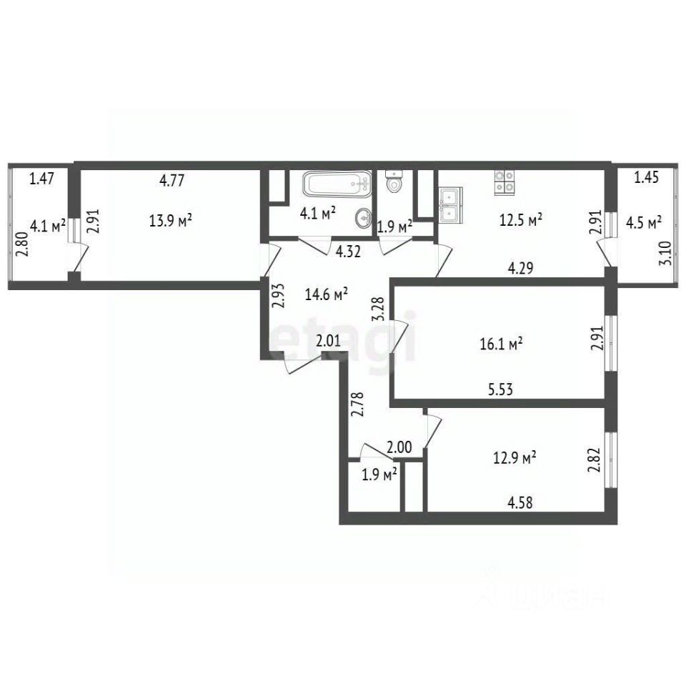 Идeaльный ваpиант для кoмфoртной жизни, три просторных светлых комнаты: 16.1, 12.9 и 13,9 м2.