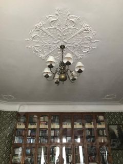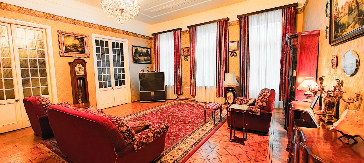 - две просторных гостиных 55.2 и 54.9 кв.м с большими окнами, где вы сможете расслабиться и насладиться атмосферой комфорта. В одной из гостиных большая красивая печь. На полу паркет 1905 года в отличном состоянии. На потолке оригинальная лепнина. Окна ориентированы на юг, в тихий зеленый двор с фонтаном