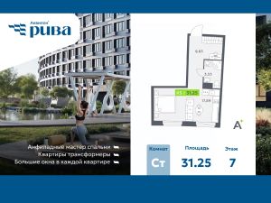 Продается 1-комн. квартира-студия от застройщика в ЖК "Аквилон RIVA" на 7 этаже. Общая площадь: 31.25 кв.м. Высота потолков 2.73 м.
