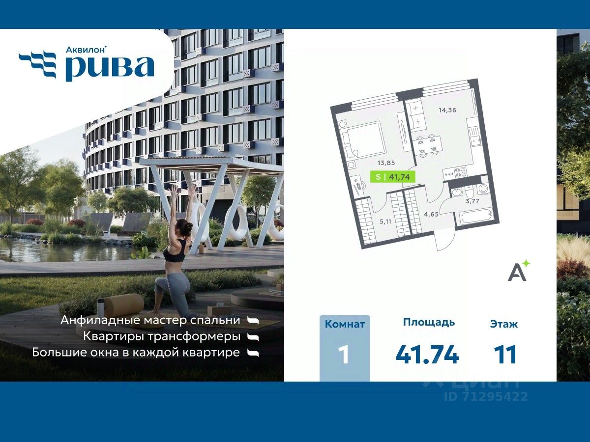 Однокомнатная квартира в ЖК "Аквилон RIVA" на 11 этаже. Общая площадь: 41.74 кв.м., площадь просторной кухни-столовой: 14.36 кв.м. Высота потолков 2.73 м.