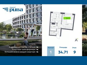 Продается 1-комн. квартира в ЖК "Аквилон RIVA" на 9 этаже. Общая площадь: 34.71 кв.м., площадь просторной кухни-столовой: 9.26 кв.м. Высота потолков 2.73 м.