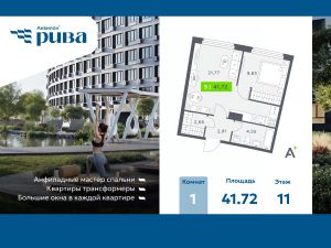 Просторная 1-комн. квартира в ЖК "Аквилон RIVA" на 11 этаже. Общая площадь: 41.72 кв.м., площадь просторной кухни-столовой: 21.77 кв.м. Высота потолков 2.73 м.