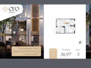 Однокомнатная квартира с отделкой в ЖК "ORO by Akvilon" на 3 этаже. Общая площадь: 36.97 кв.м., жилая: 10.44 кв.м., площадь просторной кухни-столовой: 16.79 кв.м. Все окна выходят на одну сторону. В квартире одна лоджия, один совмещенный санузел. Высота потолков 2.85 м.