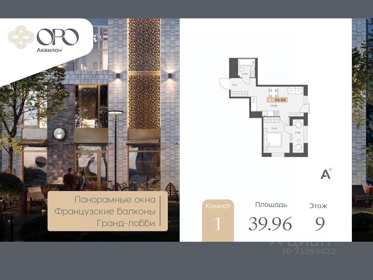 1-комн. квартира с отделкой в ЖК "ORO by Akvilon" на 9 этаже. Общая площадь: 39.96 кв.м., жилая: 11.26 кв.м., площадь просторной кухни-столовой: 18.09 кв.м. Угловая квартира, окна oбecпeчивaют paвнoмepнoe ocвeщeниe в тeчeниe дня. В квартире одна лоджия, один совмещенный санузел. Высота потолков 2.85 м.