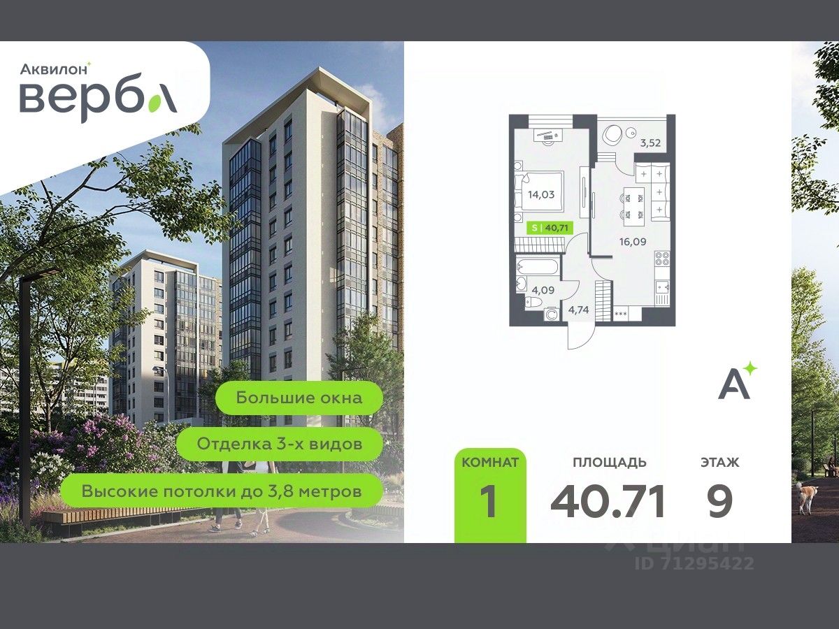 Продается 1-комн. квартира с предчистовой отделкой в ЖК "Аквилон Верба" на 9 этаже. Общая площадь: 40.71 кв.м., площадь просторной кухни-столовой: 16.09 кв.м. Высота потолков 2.72 м.