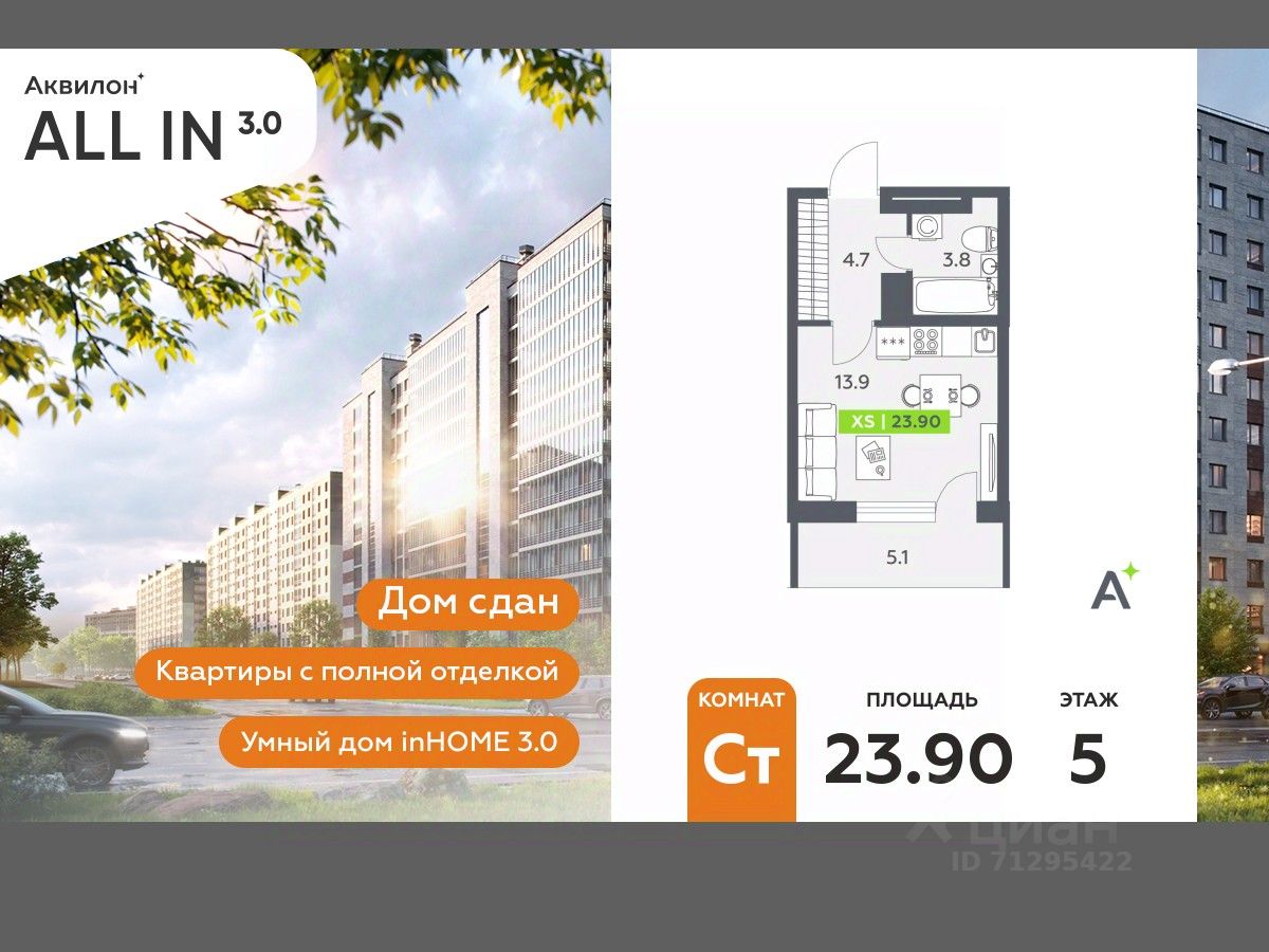 1-комн. квартира-студия с отделкой в ЖК "ALL In 3.0" на 5 этаже. Общая площадь: 23.9 кв.м. Высота потолков 2.72 м.