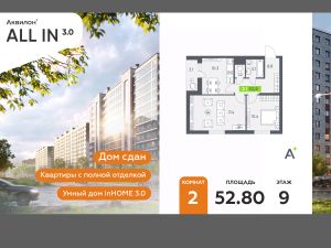 2-комн. квартира с отделкой в ЖК "ALL In 3.0" на 9 этаже. Общая площадь: 52.8 кв.м., площадь просторной кухни-столовой: 10.3 кв.м. Высота потолков 2.72 м.