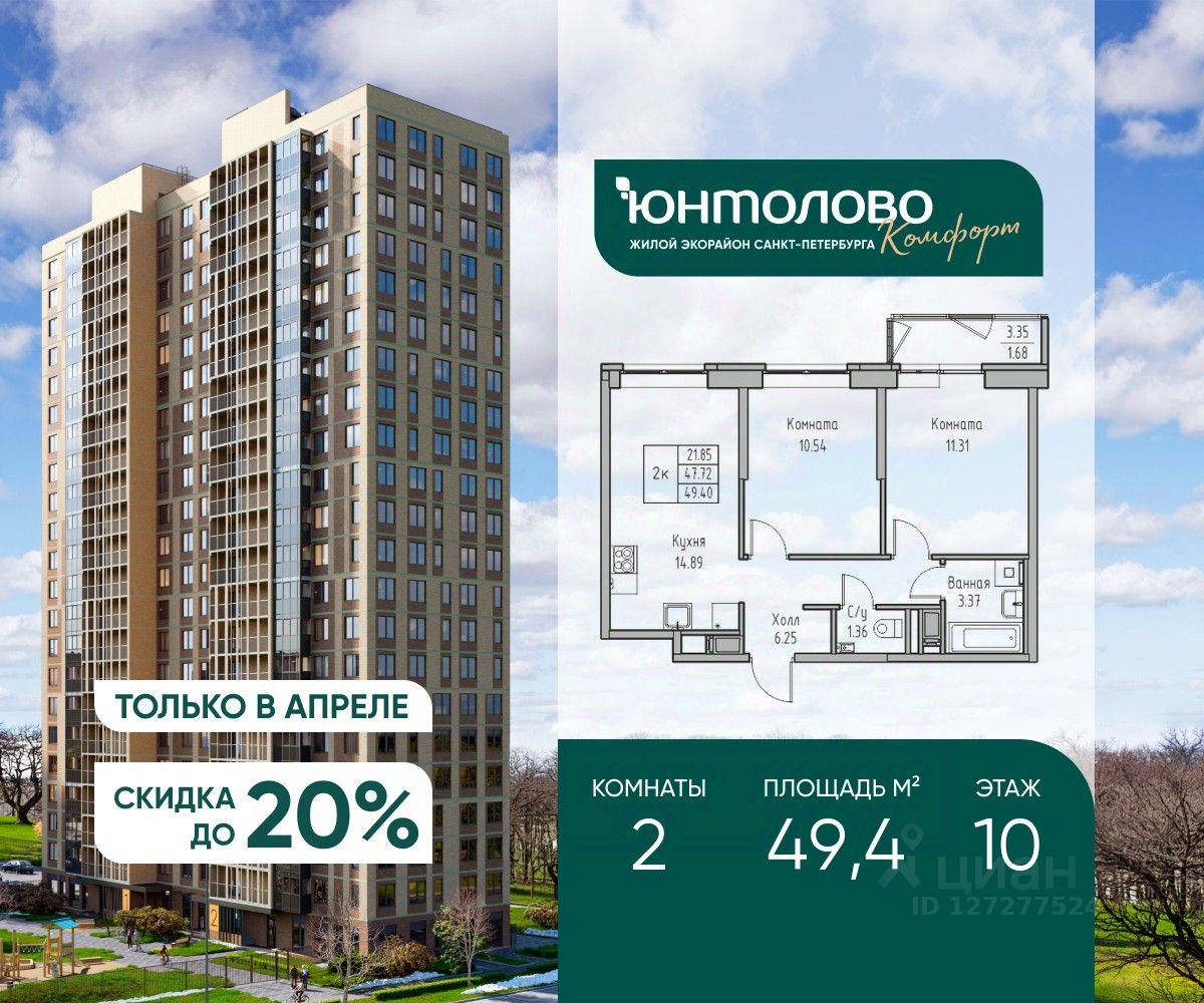 Продаeтся 2-к квартира 49.4 кв.м. экорайона "Юнтолово" (Приморский р-н) напрямую от застройщика "Главстрой Санкт-Петербург". Доступны льготная ипотека, рассрочка, трейд-ин и спецпредложения.