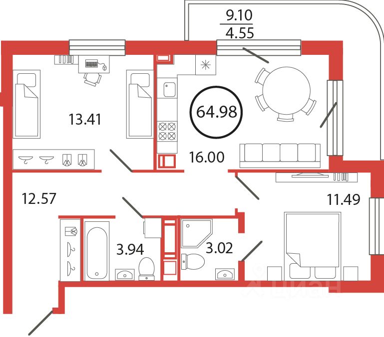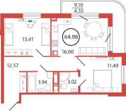 Продаётся e3 комнатная квартира (евро) в жилищном комплексе "Энфилд" (корпус Дом 21 Секция 2). Общая площадь 64,98 кв. м, площадь комнат 13,41 кв.м, 11,49 кв.м. 2 санузла. Квартира расположена на 7 этаже 12 этажного дома. Срок сдачи корпуса IV квартал 2027 года.