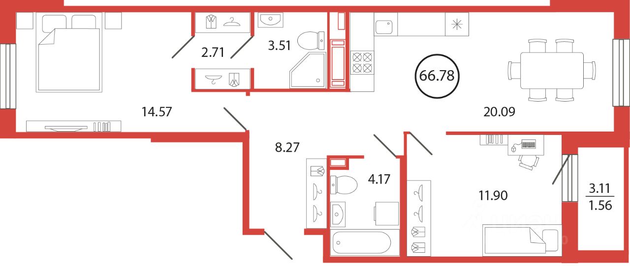 Продаётся e3 комнатная квартира (евро) в жилищном комплексе "Энфилд" (корпус Дом 18 секция 1). Общая площадь 66,78 кв. м, площадь комнат 11,9 кв.м, 14,57 кв.м. 2 санузла. Квартира расположена на 4 этаже 12 этажного дома. Срок сдачи корпуса IV квартал 2027 года.