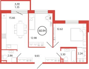Продаётся e3 комнатная квартира (евро) в жилищном комплексе "Энфилд" (корпус Дом 18 секция 2). Общая площадь 60,94 кв. м, площадь комнат 12,98 кв.м, 12,62 кв.м. 2 санузла. Квартира расположена на 5 этаже 12 этажного дома. Срок сдачи корпуса IV квартал 2027 года.