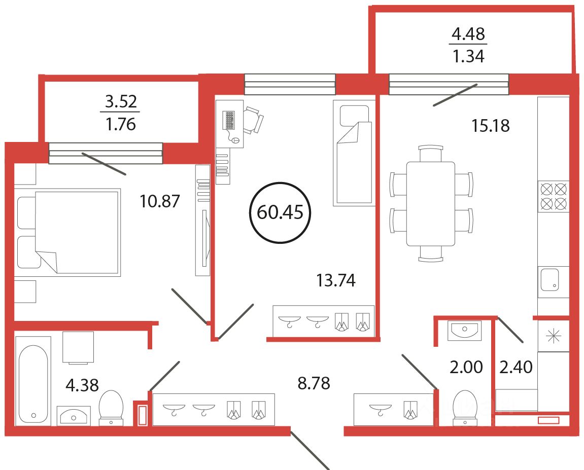 Продаётся e3 комнатная квартира (евро) в жилищном комплексе "Энфилд" (корпус Дом 18 секция 2). Общая площадь 60,45 кв. м, площадь комнат 10,87 кв.м, 13,74 кв.м. 2 санузла. Квартира расположена на 6 этаже 12 этажного дома. Срок сдачи корпуса IV квартал 2027 года.