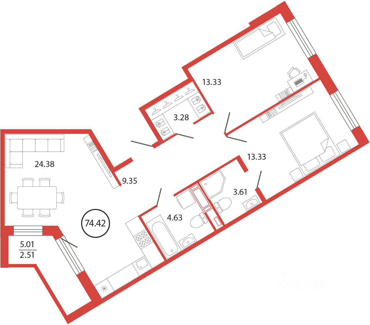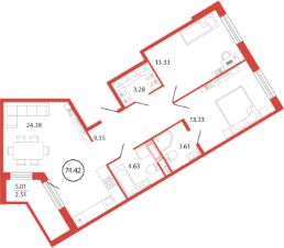 Продаётся e3 комнатная квартира (евро) в жилищном комплексе "Энфилд" (корпус Дом 18 секция 4). Общая площадь 74,42 кв. м, площадь комнат 13,33 кв.м, 13,33 кв.м. 2 санузла. Квартира расположена на 3 этаже 12 этажного дома. Срок сдачи корпуса IV квартал 2027 года.
