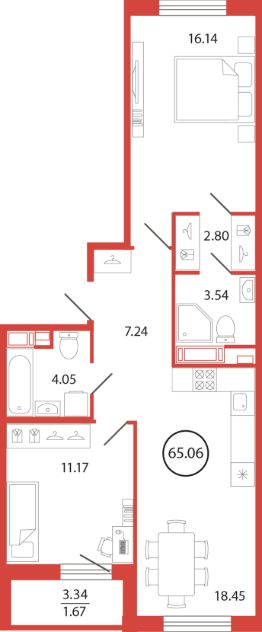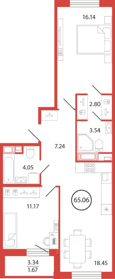 Продаётся e3 комнатная квартира (евро) в жилищном комплексе "Энфилд" (корпус Дом 18 секция 7). Общая площадь 65,06 кв. м, площадь комнат 16,14 кв.м, 11,17 кв.м. 2 санузла. Квартира расположена на 7 этаже 12 этажного дома. Срок сдачи корпуса IV квартал 2027 года.