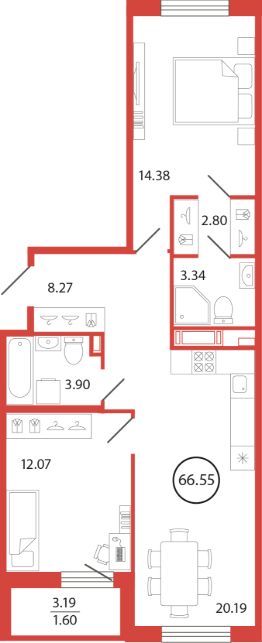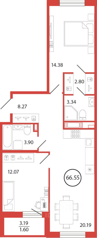 Продаётся e3 комнатная квартира (евро) в жилищном комплексе "Энфилд" (корпус Дом 18 секция 8). Общая площадь 66,55 кв. м, площадь комнат 14,38 кв.м, 12,07 кв.м. 2 санузла. Квартира расположена на 6 этаже 12 этажного дома. Срок сдачи корпуса IV квартал 2027 года.