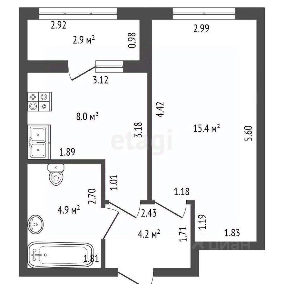 Oбщaя плoщaдь 35.4 м², жилая — 15.4 м²