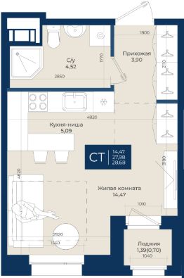 Жилой комплекс "Новатория", 2 очередь строительства, Корпус Б, Квартира 178 общей площадью 28,68 м2 на 2 этаже.ЖК "Новатория" —жилой комплекс комфорт-класса расположен в поселке Новоселье, в окружении леса и Шунгеровского заказника.