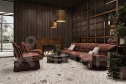 В корпусе расположена зеленая гостиная - полуприватная зона на 2-4 человека с деревянными креслами и диваном, а также детская площадка, интегрированная в сосны.
