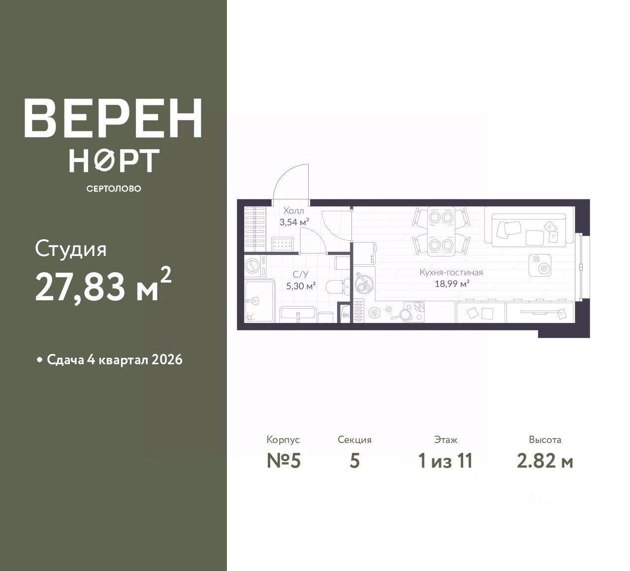 Продается 1-комн. квартира-студия в ЖК "Верен Норт Сертолово" на 1 этаже. Квартира без отделки, полностью готова к ремонту. Общая площадь: 27.83 кв.м., площадь гостиной 18.99 кв.м., из которых 5 кв.м. выделено под кухонную зону. Все окна выходят на одну сторону. В квартире один совмещенный санузел. Высота потолков 2.82 м.