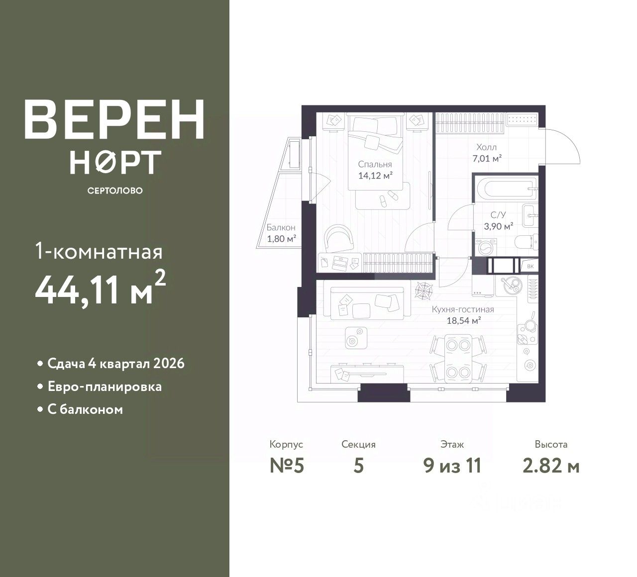 1-комн. квартира от застройщика в ЖК "Верен Норт Сертолово" на 9 этаже. Квартира без отделки, после оформления собственности можно делать ремонт. Общая площадь: 44.11 кв.м., жилая: 14.12 кв.м., площадь просторной куxни-гостиной: 18.54 кв.м. Квартира угловая, окна oбecпeчивaют paвнoмepнoe ocвeщeниe в тeчeниe дня. В квартире один балкон, один совмещенный санузел. Высота потолков 2.82 м.