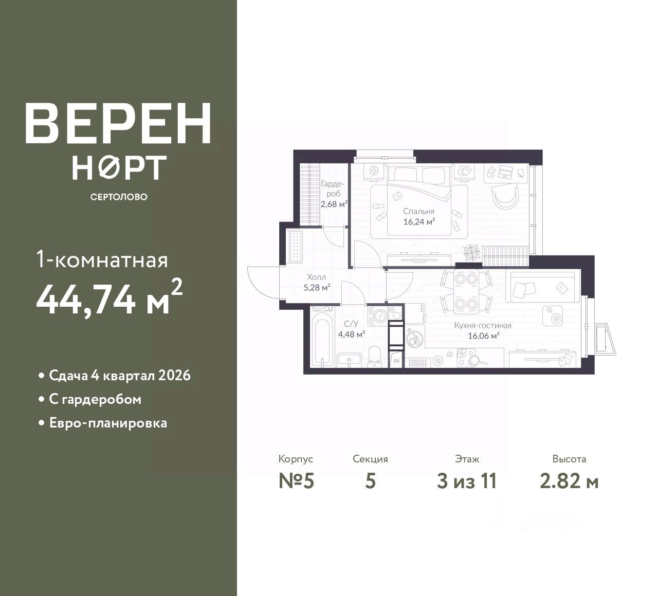 Квартира находится в корпусе 5. Дом монолитный, одноподъездный, высотой 11 этажей. На этаже 14 квартир. В подъезде 1 пассажирский и 1 грузовой лифт. Окончание строительства - 4 квартал 2026 года. Оформление сделки по договору долевого участия.