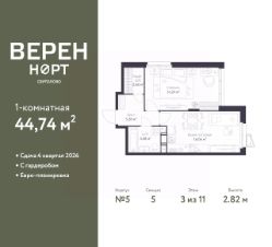 Продается 1-комн. квартира в ЖК "Верен Норт Сертолово" на 3 этаже. Квартира без отделки, после оформления собственности можно делать ремонт. Общая площадь: 44.74 кв.м., жилая: 16.24 кв.м., площадь просторной куxни-гостиной: 16.06 кв.м. Квартира угловая, идеально подойдет любителям тишины и панорамных видов. В квартире один совмещенный санузел. Высота потолков 2.82 м.