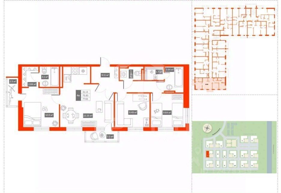 Общая площадь: 78 м². Жилая площадь: 31,1 м². Кухня: 22,3 м². Этаж: 5 из 5. Год постройки дома: 2023. Отделка: предчистовая.