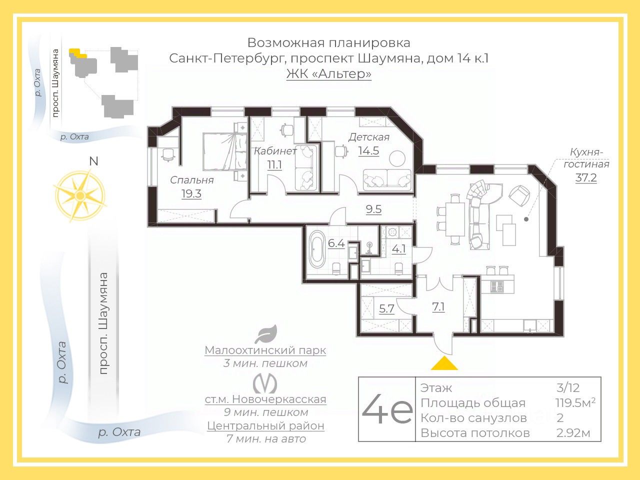 Планировка включает в себя кухню-гостиную (37,2м²) с тремя окнами, хозяйскую спальню (19,3м²), две детские (14,5м² и 11,5м²), гардеробную (5,7м²) и 2 больших санузла (6,4м² и 4,1м²).