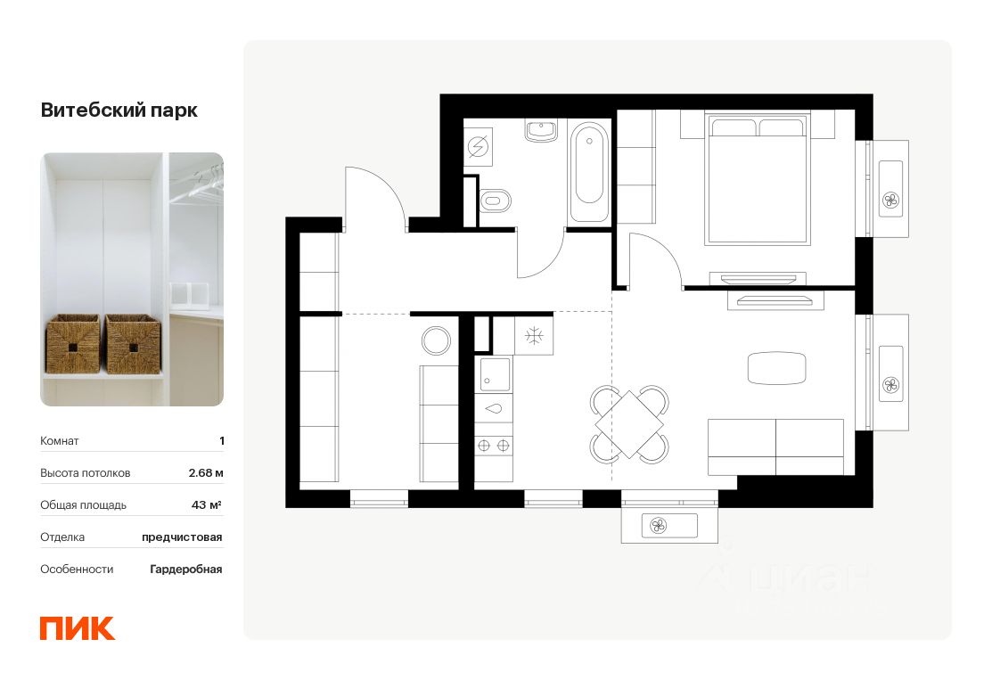 Продаётся 1-комн. квартира площадью 43 кв.м на 10 этаже 12 этажного дома (Корпус 6, Секция 4) проекта ПИК Витебский парк. Светлый просторный подъезд на уровне земли, функциональная планировка, большие окна, c отделкой.
