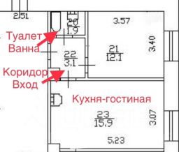 Две смежные комнаты с ОТДЕЛЬНЫМ ТУАЛЕТОМ и ВАННОЙ (2кв.м) и коридорчиком (3кв.м).