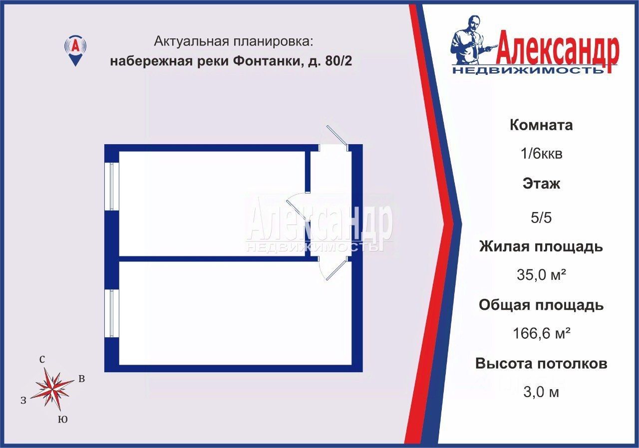 1703555 Продается просторная и светлая комната 35 кв. м, 5/5 этаж в 6-ти комнатной коммунальной квартире.