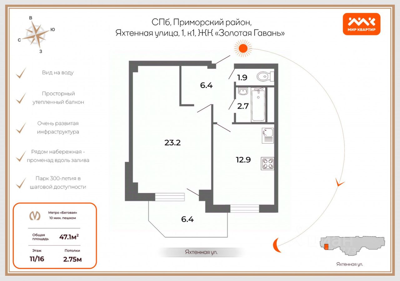 Рядом с домом - вся необходимая для жизни инфраструктура: большой выбор магазинов и всевозможных лавок, современный детский сад с бассейном, школы, кафе и рестораны; быстрый и комфортный выезд как загород так и в центр города. До станции метро Беговая 7-10 минут пешком и через 15 минут Вы в центре города!