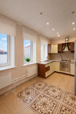 Главное преимущество — большая кухня-гостиная 29,1 м² с тремя окнами. Много света, ощущение пространства и воздуха. Пространство объединено с зоной прихожей, за счёт чего квартира стала более удобной и современной.